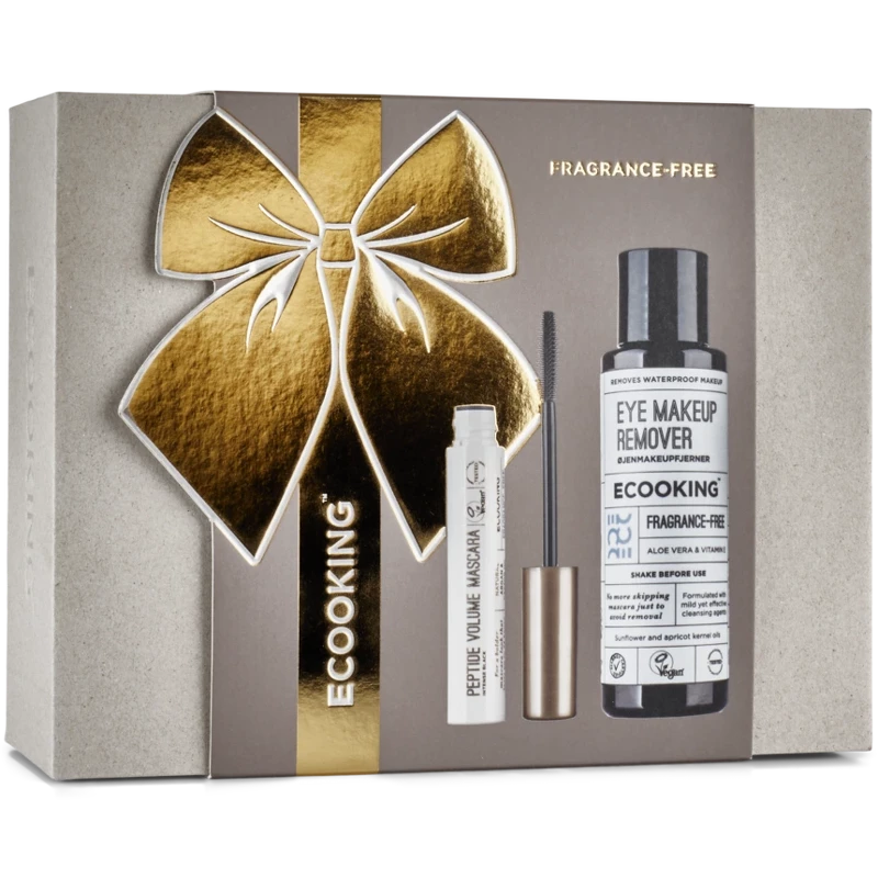 Ecooking Hi-Bye Makeup - Box 2025 er en fin gaveæske, som indeholder en mascara med masser af volumen og en skånsom makeupfjerner - hej til flotte vipper, farvel til bøvl med at fjerne makeuppen igen. Peptide Volume Mascara giver vipperne løft, længde o